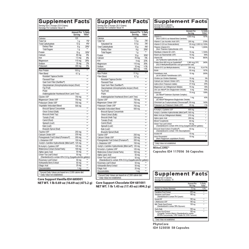 The Core Restore® program is a strategic system designed to safely enhance and promote all three pathways of active detoxification. The Core Restore® kit includes three active formulas—Core Support, MitoCORE®, and PhytoCore—which function synergistically to provide the energy and nutritional cofactors critical for active biotransformation. These formulas support both Phase I and Phase II pathways of liver biotransformation while promoting Phase III elimination pathways, aiding in the safe processing and removal of environmental pollutants, hormone disruptors, unhealthy estrogen metabolites, xenoestrogens (synthetic compounds that imitate estrogen) and other harmful toxins from the body. This powerful trio of specialized formulas provides essential micronutrients, phytonutrients and a source of easily digested, hypoallergenic protein that support the liver and fuel optimal biotransformation.
