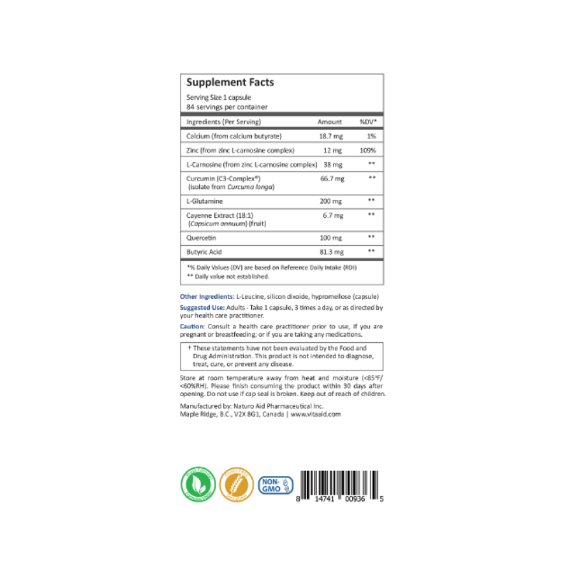 - Modulates inflammation and histamine actions - ensure gut lining integrity and regulate acid secretion †