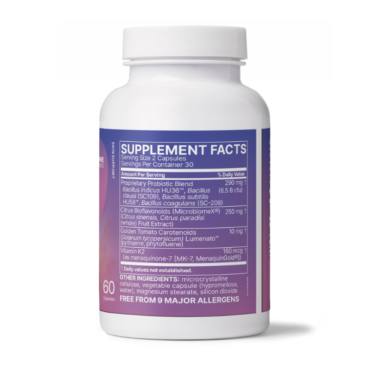 SereneSkin taps into the gut-skin connection: by modulating gut microbes with spore-forming probiotics, it supports systemic and skin immune balance, microbiome resilience, and skin health from the inside out. The added Vitamin K2 contributes to skin tissue and microbial support.